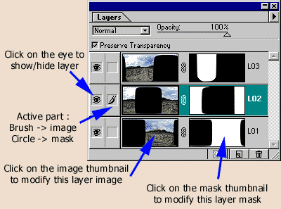 1 - Correcting the sky This is the easy part : because of the diffuse nature of clouds, all you have to do is to make the blending between images more progressive. This method is very effective when there is no contrasted object near the seam : color shifts or brightness differences are softened and become invisible. But it should be avoided in detailed zones because if images do not overlap perfectly you will have ghosts (partially transparent details) duplicated near the seam. That's why we will apply this only to the sky. Before going on, some background on layers and masks is needed... Looking at the layer palette window, you can see that the image is composed of three overlapping layers, each associated with a transparency mask. This mask is white where the layer is opaque and black where it is transparent, revealing the underneath layers. Grey zones of the mask give partial transparency, partly showing top and bottom layers. To locate the seams, you can click on the small eye located in front of layers in the palette to show/hide that layer.